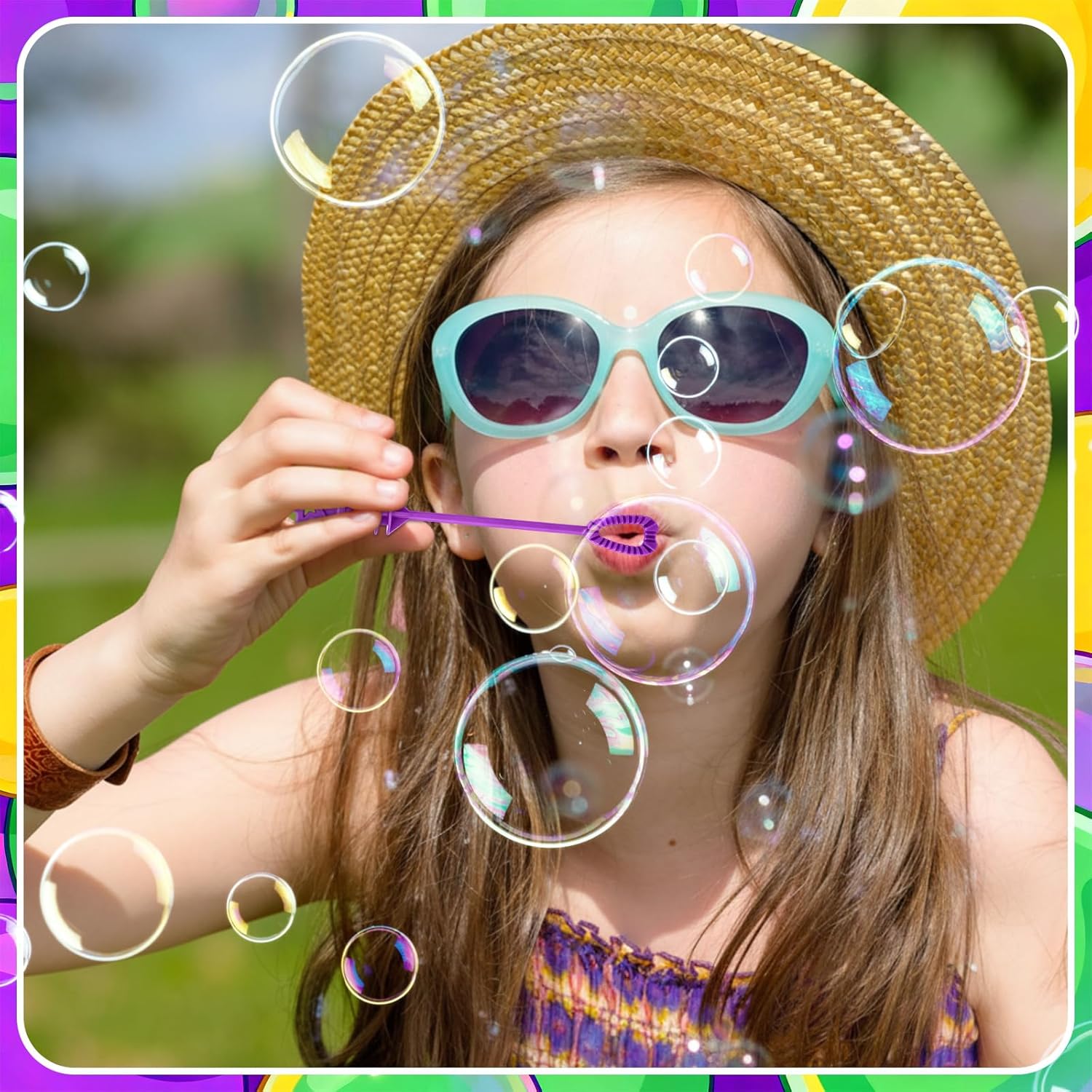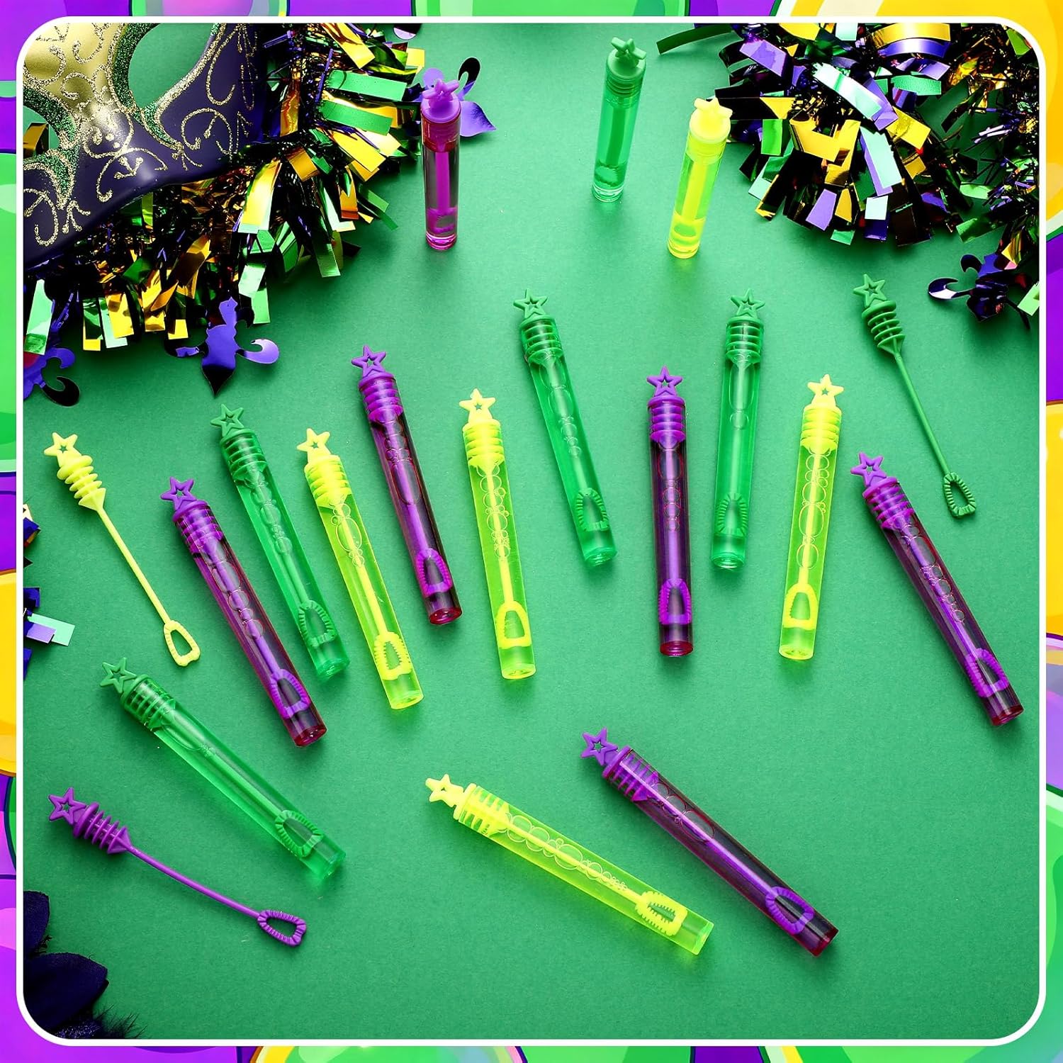 Suitable for people over 6 years old, It's recommended to use under the supervision of adults in case of choking risk. Features: Anti-Overflow Design: Say goodbye to messy spills with our thoughtful anti-overflow feature. Each Mini Small Bubbles Wand is designed to prevent liquid leakage, offering a delightful and clean experience. These bubbles are suitable for both indoor and outdoor activities, These bubbles are suitable for both indoor and outdoor activities, providing worry free fun and allowing everyone to focus on the celebration at hand. Easy-to-Open: Our Bubble Wands are not just easy to use, they're a breeze to open too. These party bubbles are centered around user-friendly design and are suitable for small hands. Children can easily access the joy within, making them an exciting addition to any gift box or favor bag at parties and celebrations of all kinds. Specifications: Material: plastic Color: purple, dark green, yellow Size: 4.2 inch Package includes: 150 x Bubble Wands Notes: Manual measurement, please allow slight errors on size. The color may exist a slight difference due to different screen displays